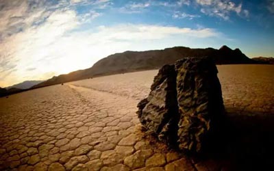 این سنگ هایی که در منطقه می بینید به صورت خیلی عجیبی به اطراف حرکت می کنند و ردپای خود را بر جای می گذارند.طبق نظریه محققان زمانی که باران می بارد و زمین لغزنده می شود این سنگ ها بر اثر وزش باد به اطراف حرکت می کنند.