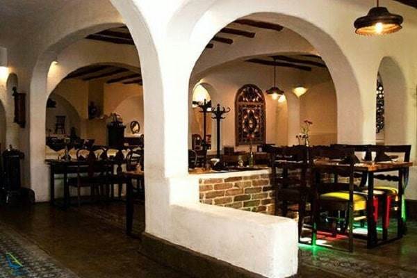 وقتی از درب ساده رستوران داخل می شوید، در حیاط حوض آبی به رنگ فیروزه ای مشاهده می کنید که جلوه زیبایی به محیط بخشیده است که درون آن را با گل های زیبا پر کرده اند. همچنین در سمت راست یک نانوایی سنی کوچک وجود دارد که در آن به پخت نان های سنتی می پردازند، این نان ها در کنار پیش غذا و خوراک های سفارش داده شده در اختیار مشتریان قرار می گیرد. ورودی رستوران دارای درب چوبی و کوچکی است که از آن طریق وارد فضای متفاوت داخلی می شوید. فضای داخلی رستوران به سبک دوران صفویه طراحی شده و دارای جذابیت های بصری زیادی می باشد؛ تلویزیون قدیمی و کوچک، لوسترهای خاص، پنجره های رنگارنگ، میز و صندلی های چوبی زیبا، تفنگ های دیواری، فضاهای حجره ای خانوادگی، صندلی های لهستانی، اتوی ذغالی و دیگر تزئیناتی که در جای جای رستوران قرار گرفته گردشگران تور تهران را به وجد می آورد. در واقع گلدان های موجود در رستوران شیشه های دوغ آبعلی بوده و لوسترها نیز طاس های بسیار قدیمی می باشند.